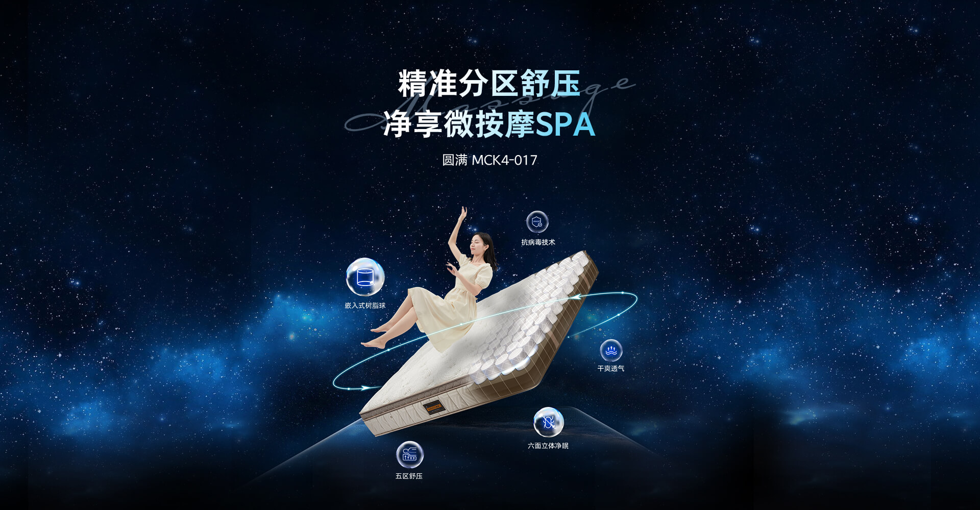 81个波点太空树脂球+约2150个蛋形波浪绵将床垫 舒适层划分成不同舒缓程度的三区五段设计,根据 身体不同部位匹配相应轻微指压按摩触感。